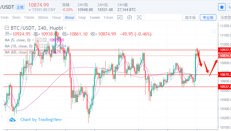 比特币最近整体上一直在围绕10500-900走区间震荡,昨日日内价格再次回撤至10530附近后反弹,晚间价格上冲至10950附近后承压回修,目前位于10870附近震荡,今日可继续关注10950-11000区域压力的试探情况。联系薪火获取实时操作策略。