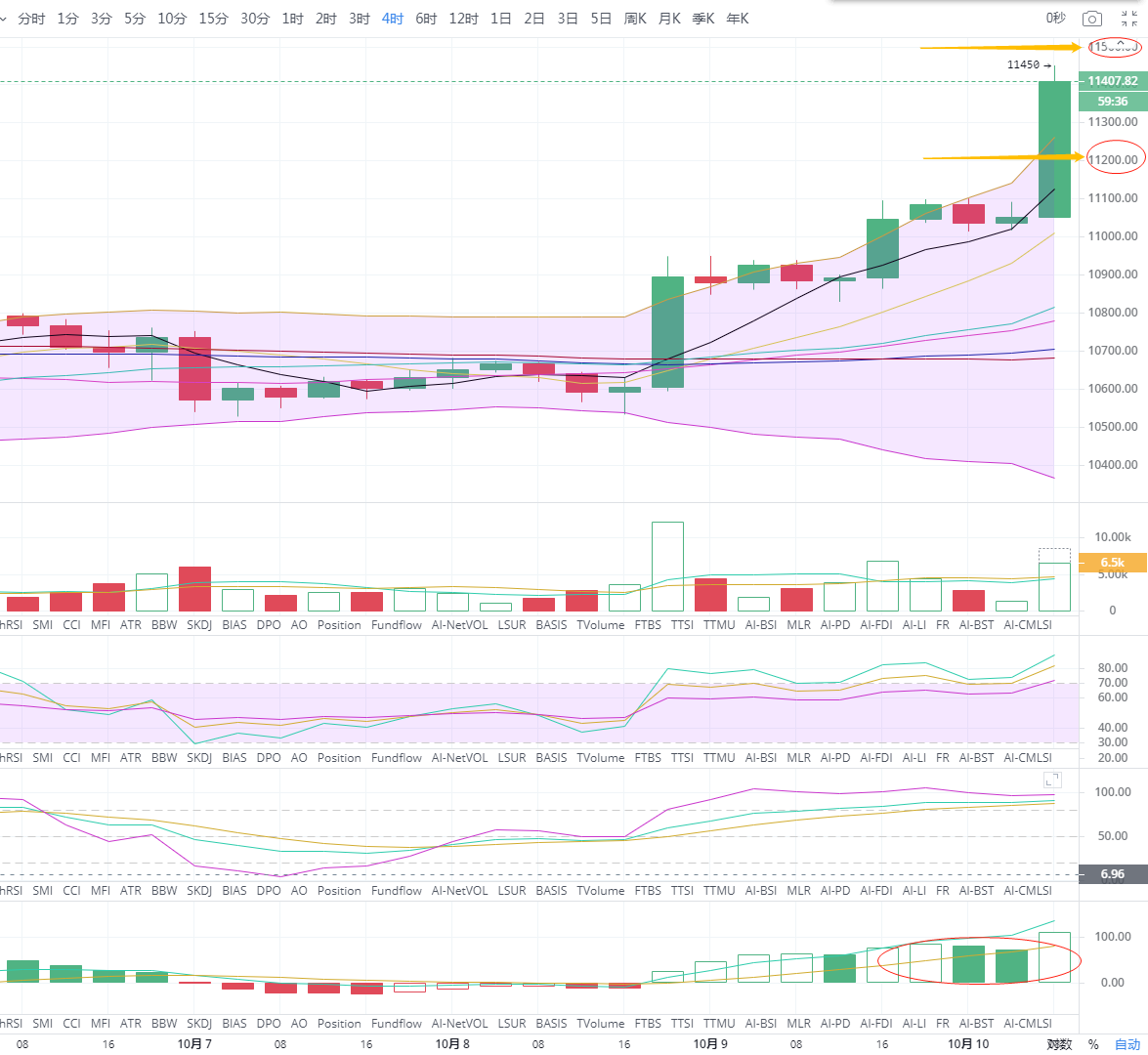 比特币近日三收阳,经过国庆的几天盘整后,多头已完全主导,大涨势头依旧保持,昨日日内横盘,于晚间6点再次迎来一波上涨,时隔20天终于再次触及到11100一线,早间更是冲高11400一线,期待后市再次冲高。