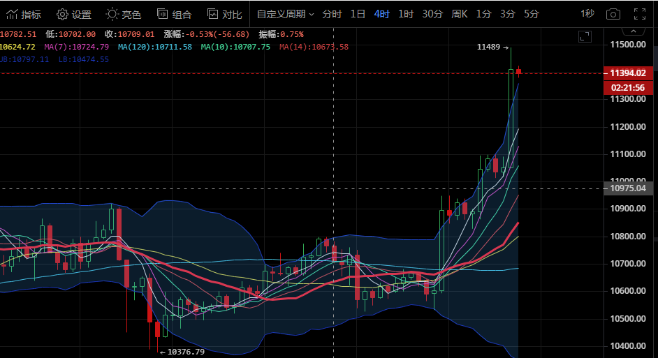 比特币昨日白盘行情持续集中在10500-10700震荡,晚间比特币价格再次拉上两百余点,今日凌晨最高触及11100位置,之后价格再刷新高至11489,拉升350余点,目前价格稳定在11396附近。