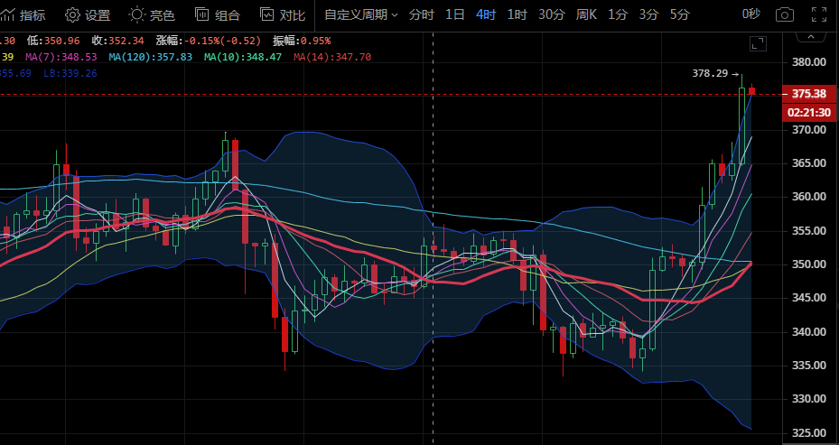 以太坊从昨晚开始行情连续拉升,币价重心不断上移,今日早间行情向上触及最高点368.2后回落。刚刚行情再刷新高378.29,目前稳定在375附近运行。