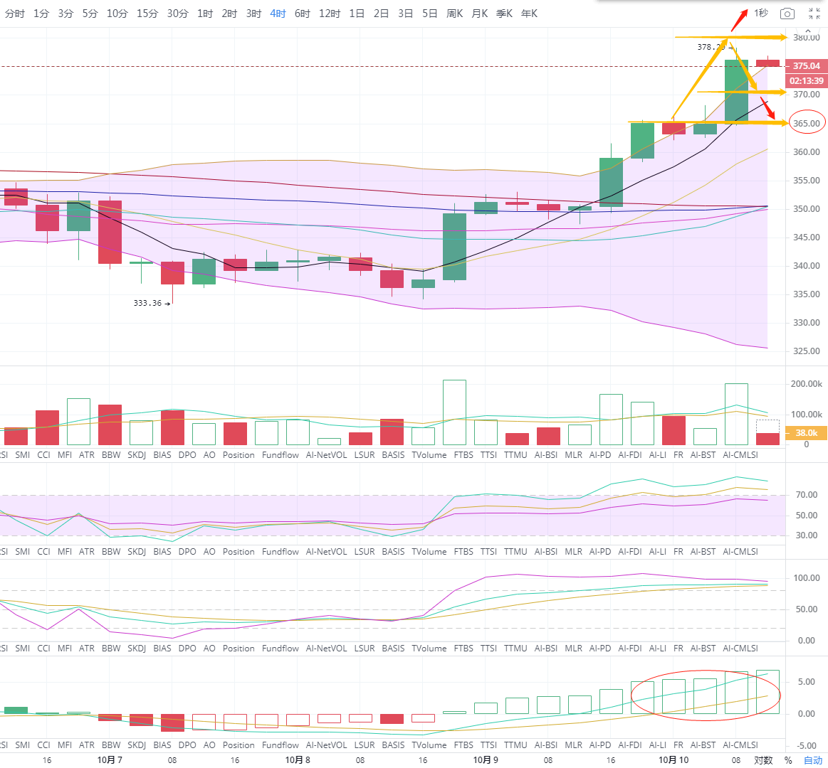 看四小时线,价格联动比特币出现多头强势拉升,目前受阻于378一线,布林带呈张口状态,价格不断上行沿上轨附近运行,各均线保持上攻姿态,短期受5日均线支撑上行。幅图指标MACD于0轴上方金叉运行,KDJ指标于超买区域运行,但是RSI指标三线已向下拐头,EMV指标有下穿迹象,继续关注比特币联动为主。谨防追涨杀跌,上方压力位376-380,下方支撑位370-365。操作上低多为主,高空为辅。