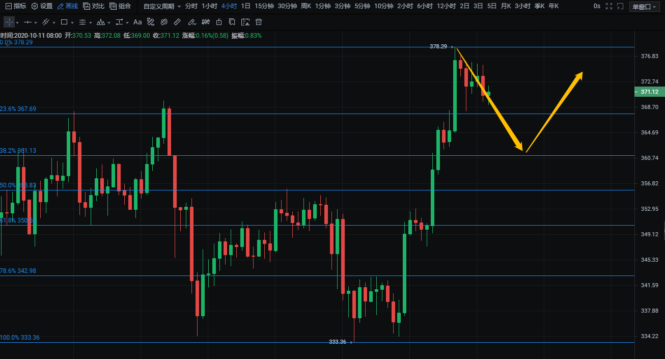 以太坊四小时级别来看价格于378受阻回落,晚间整体波动较小,处于高位震荡,布林带呈张口状态,价格于上轨下方运行,5日均线拐头向下,短期有回调需求。幅图指标MACD于0轴上方金叉运行。KDJ指标三线向下发散,RSI指标三线向上拐头,EMV指标下穿运行,日内关注价格破位情况。谨防追涨杀跌,上方压力位378-385,下方支撑位360-365。操作上高空低多。
