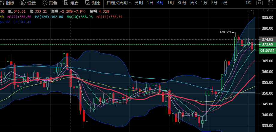 以太坊四小时级别来看,昨日午间币价上行触及最高点378.29后受阻回落,晚间整体波动较小,处于高位震荡,今日早间行情回踩至369附近反弹。布林带呈张口状态,币价稳定在中上轨区域运行,MA5向下拐头,短期有一定回踩需求。附图中MACD快慢线走势平缓运行在零轴上方,绿色动能柱缩量,KDJ指标三线向下发散,多头趋势放缓。汐柔建议日内关注下方支撑360-365,上方关注378-380,预计高位震荡为主,操作建议高空低多,破位顺势跟进。