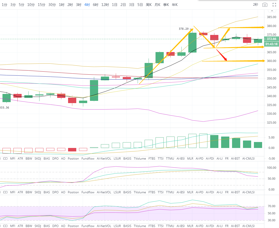 策略三:下破365顺势空单进场,止损368,目标362,再看358