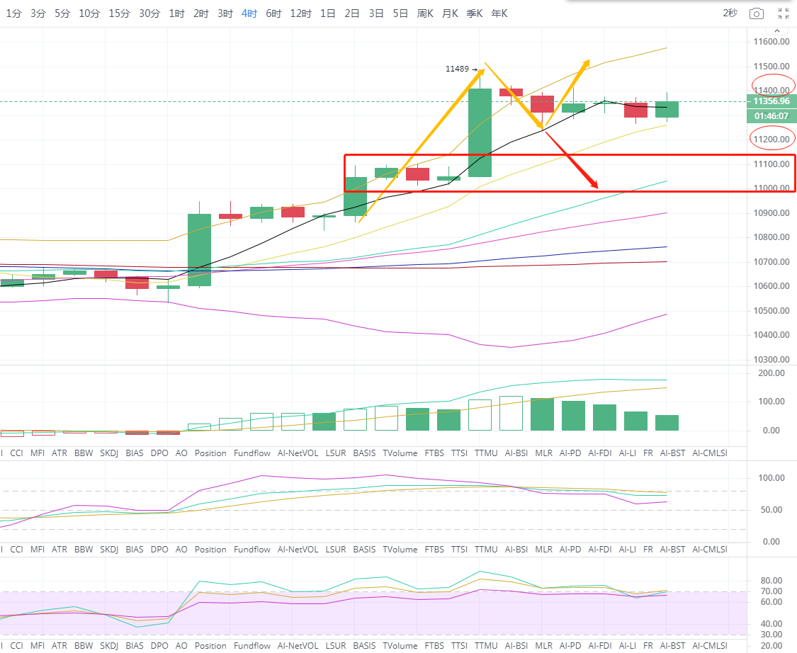 策略一:回踩11100-11200附近多单进场,止损11000,目标11400