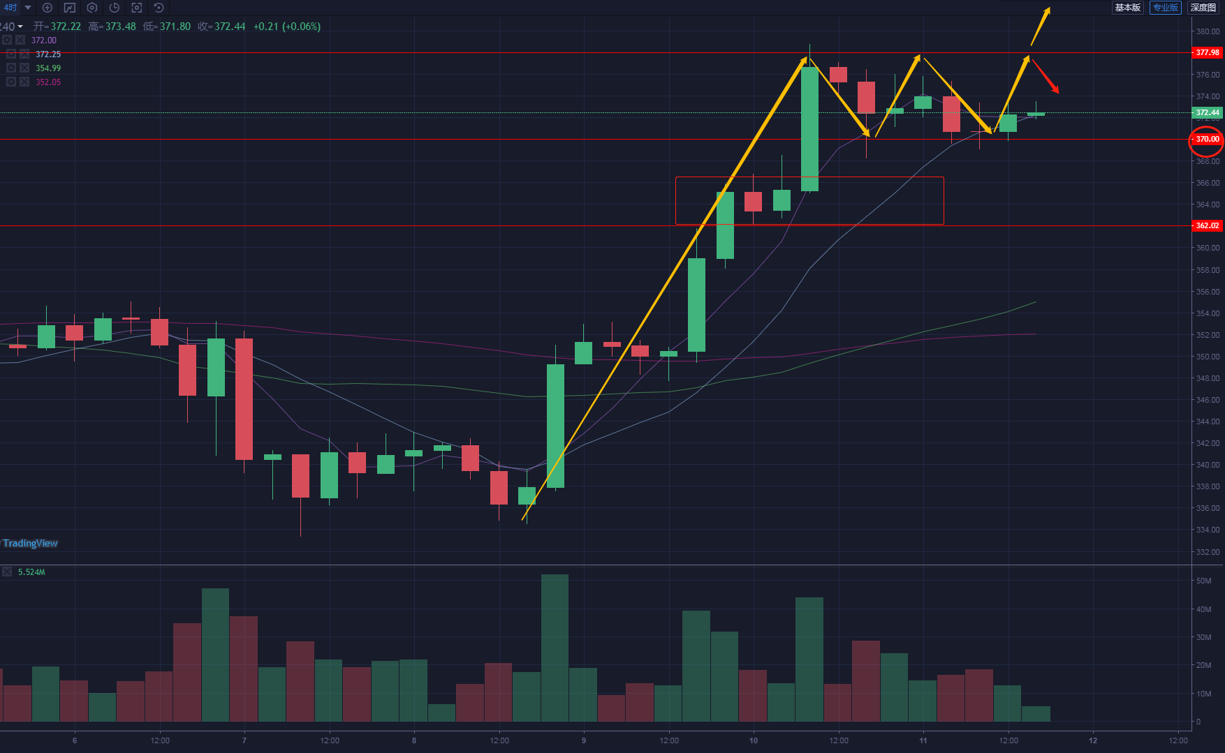 昨日以太坊早间大幅拉盘冲高至378位置,随后370-378区间震荡,早间价格来到369一线,但是迅速反弹,下方支撑依然很强,日内横盘,价格短期还有回调需求。看日线图,价格已经补上国庆那波跳水的缺口,但距离九月份前高仍有一段距离,目前受阻于斐波那契78.6和MA60日均线的双重压制未能继续上探。RSI和KDJ指标三线依旧上扬 V(sx13669) ,MACD指标多头量能柱持续放量,大趋势还是看涨,但短期可以抓一波回调。