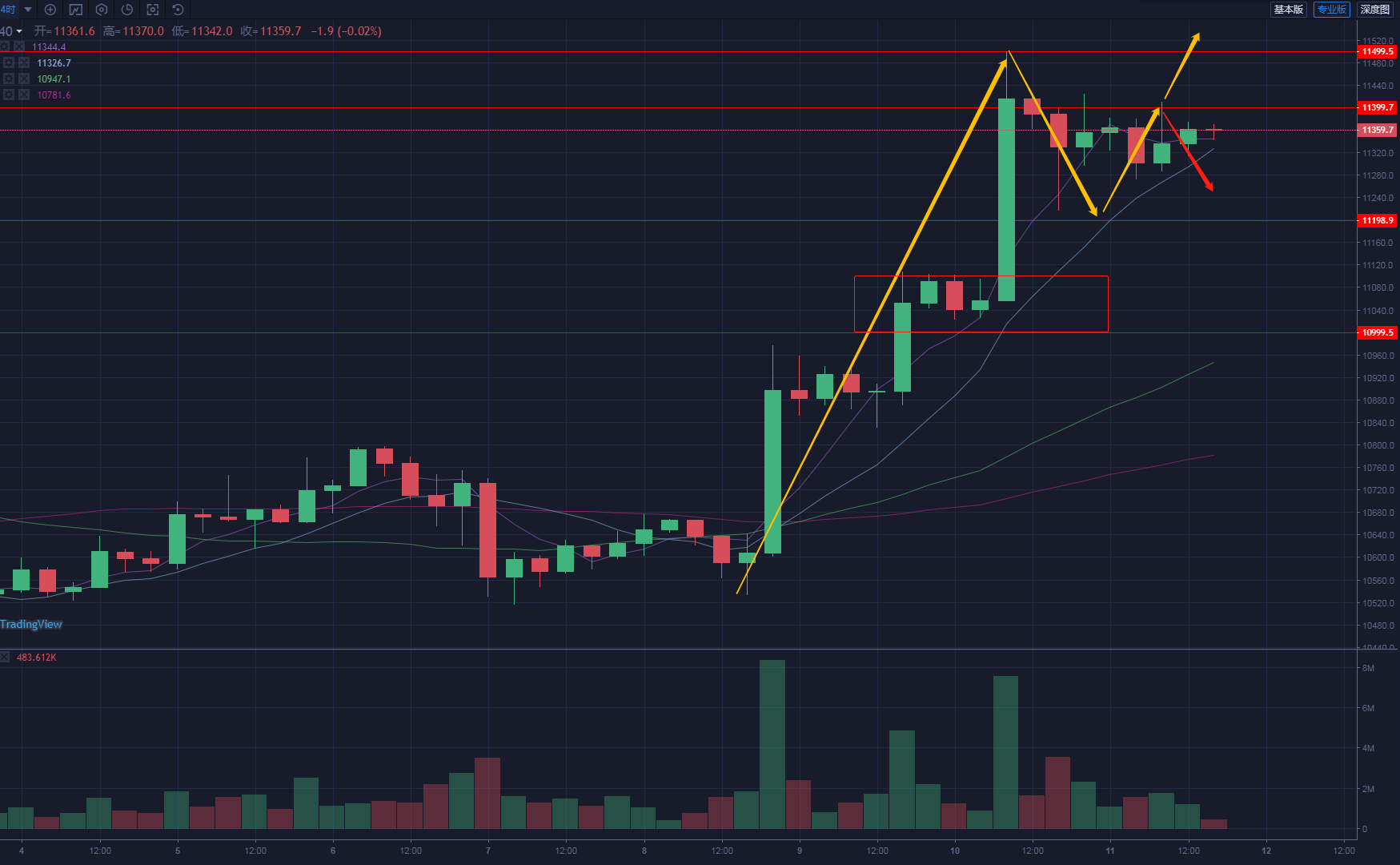 策略一:回踩11100-11200附近多单进场,止损11000,目标11400