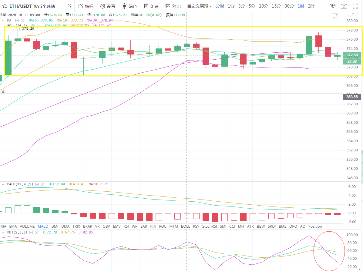 以太坊从日线上看连续两晚都进行了拉升,高点不断上移,MA05和MA10均线在370附近金叉后呈向上运行姿态,币价上破布林上轨后回落上轨和中轨附近,MACD快慢线让呈战斗姿态向上运行,多头能量柱似有缩量之态,KDJ三线在超买区向下拐头聚拢,从四小时来看,布林轨道开口向上姿态,MA5由前期的支撑拐头下行,形成压制,目前币价受MA10的支撑没有进一步下行,技术上,MACD快慢线向上趋势放缓,多头逐步缩量,RSI高位拐头下移,KDJ三线聚合在80附近死叉向下发散,雅晴建议反弹看空为主,回调看多为辅。