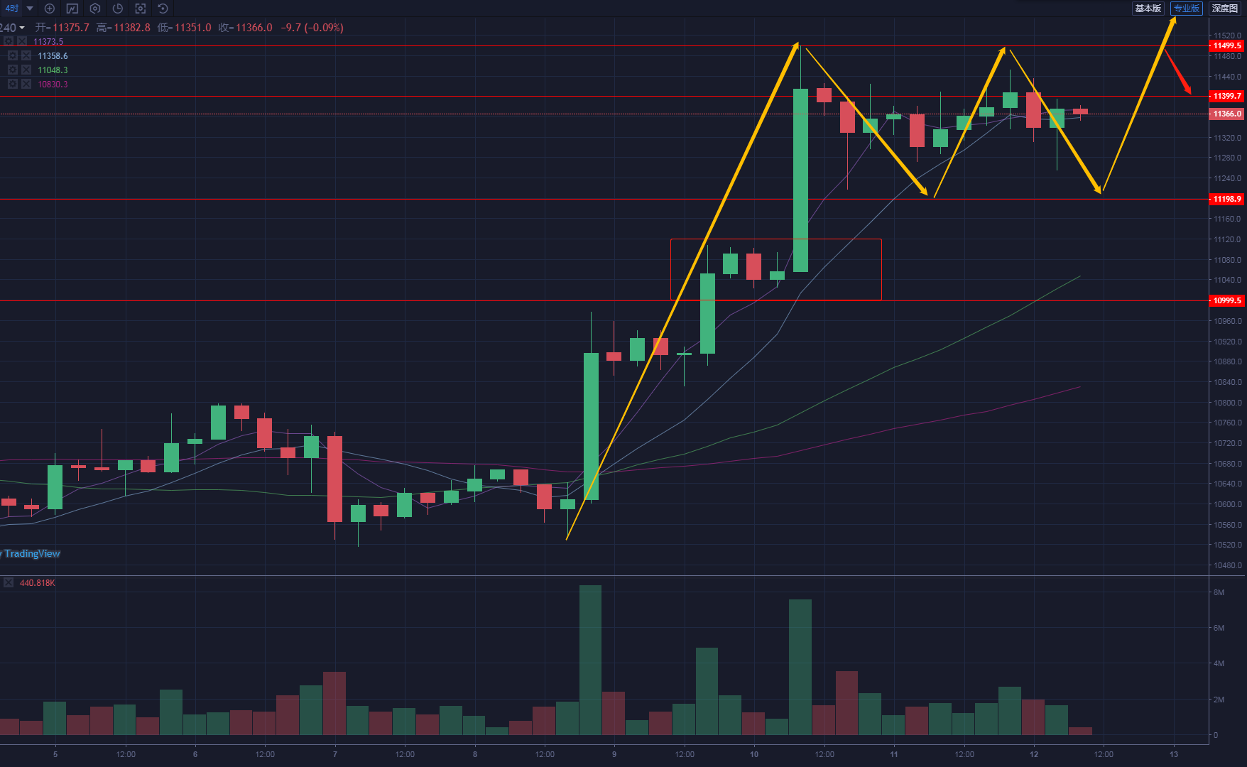 策略一:回踩11100-11200附近多单进场,止损11000,目标11400