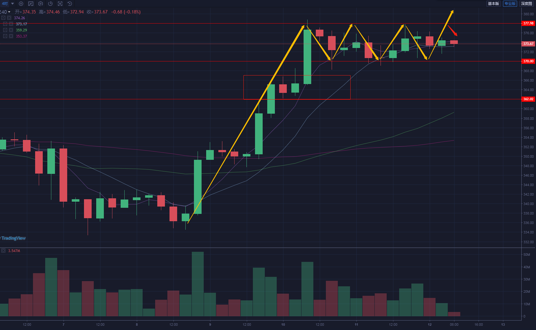 昨日以太坊没什么太大行情,依旧是区间震荡,早间价格最高也就376一线,日内预计继续横盘,价格短期还有回调需求。看日线图,价格已经补上国庆那波跳水的缺口,但距离九月份前高仍有一段距离,目前受阻于斐波那契78.6和MA60日均线的双重压制未能继续上探。RSI和KDJ指标三线依旧上扬公众号诗萱言币,MACD指标多头量能柱持续放量,大趋势还是看涨,但短期可以抓一波回调。