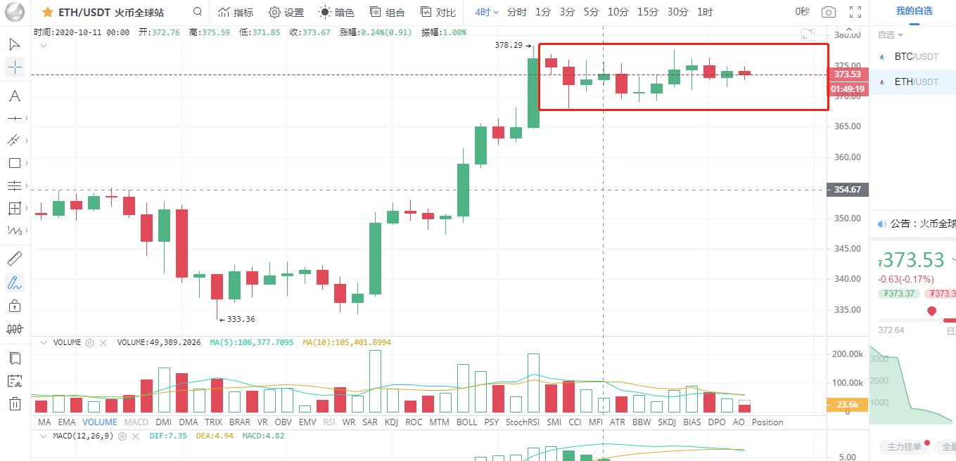 从四小时图看,布林带缩口向上,币价运行在布林带中轨上轨,以太坊整体还是处于区间震荡盘整,走势相对较弱,波幅不过10点,日内若不能突破压制,行情将延续震荡。附图MACD双线粘合在零轴上方运行,红色动能柱开始放量。上方压力位378,下方支撑位368.综合来看,操作上回踩做多为主。