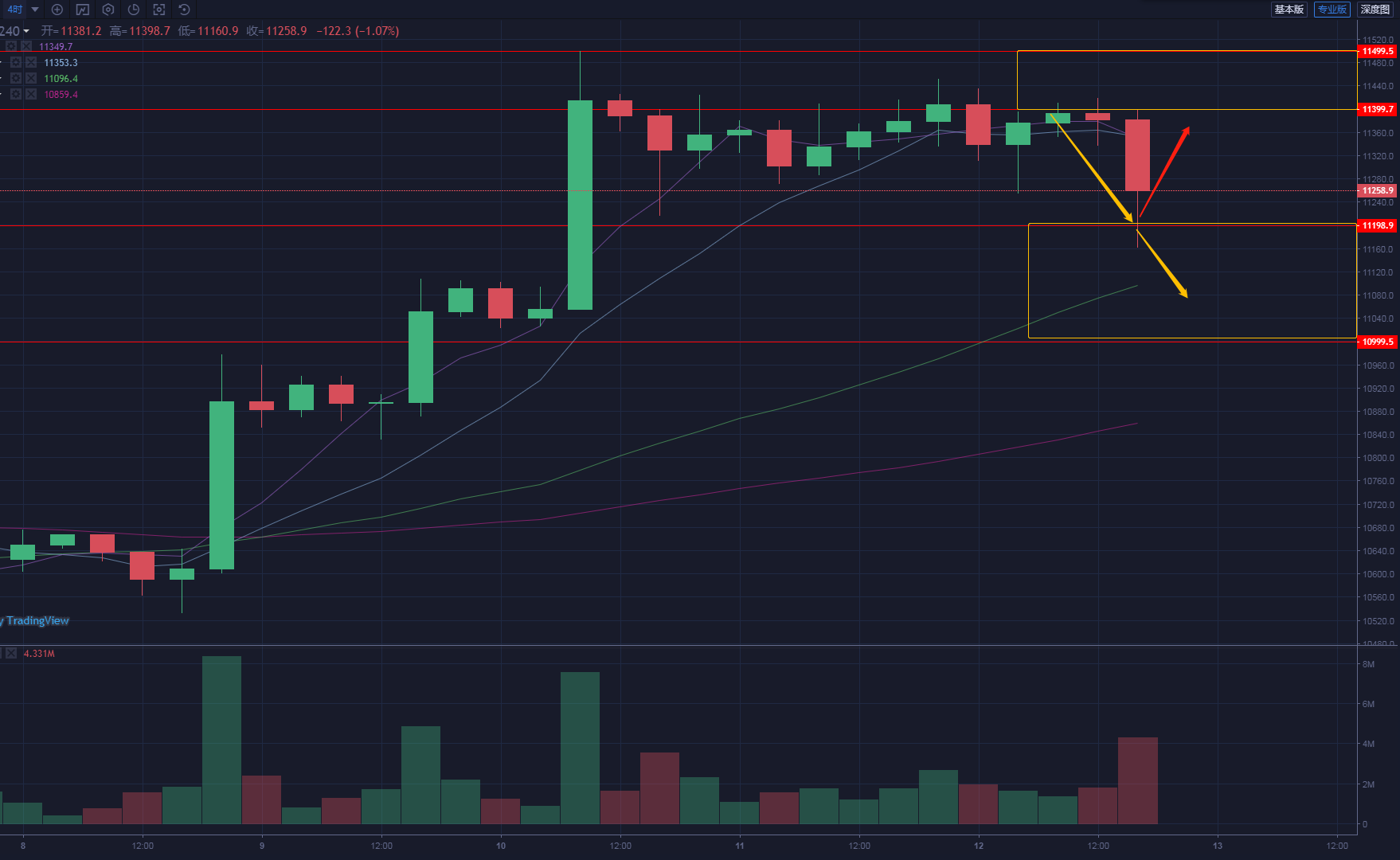 策略一:回踩11200-11260附近多单进场,止损11000,目标11350-11400,破位10500再跟