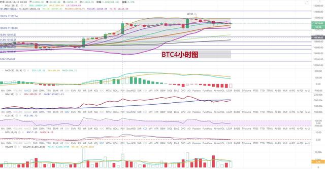 BTC行情分析:从4小时图上看,比特币行情从昨天冲高触及11724一线后,并未企稳在持币者图中箱体上方,行情整体上处于遇阻箱体顶部后的阴跌状态,目前比特币行情处于箱体中部区域。可以看到的是布林带整体上向上偏移逐渐收口,变盘也会随之而来。