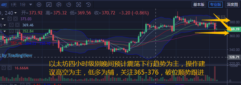 以太坊跟随大盘走势,受消息面刺激,一度下跌至365位后反弹至370附近运行,从四小时级别来看,布林带缩口向下运行,午间的回踩导致K线击穿下轨后小幅反弹,各均线微微向下拐头运行在中轨下方。附图中MACD快慢线向下拐头运行在零轴上方。红色动能柱持续放量。晚间关注376-380上方压制,下方支撑365-360,操作建议高空为主,低多为辅,破位顺势跟进