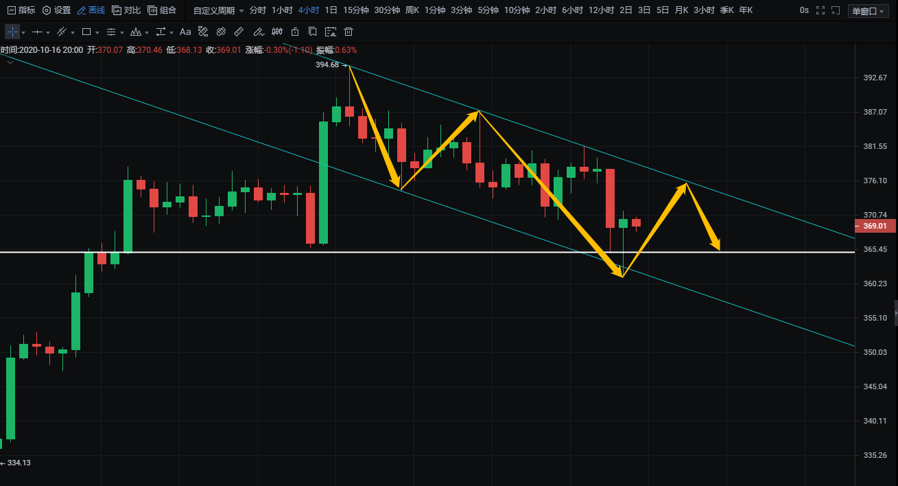 以太坊四小时级别来看价格联动比特币下跌于下行通道下轨反弹,目前行情于下跌后盘整,5日均线下穿10日均线运行,短期继续维持震荡。幅图指标MACD于0轴上方死叉运行。KDJ指标三线向下发散,RSI指标三线平缓运行。上方压力位375,下方支撑位360-365。操作上高空低多。