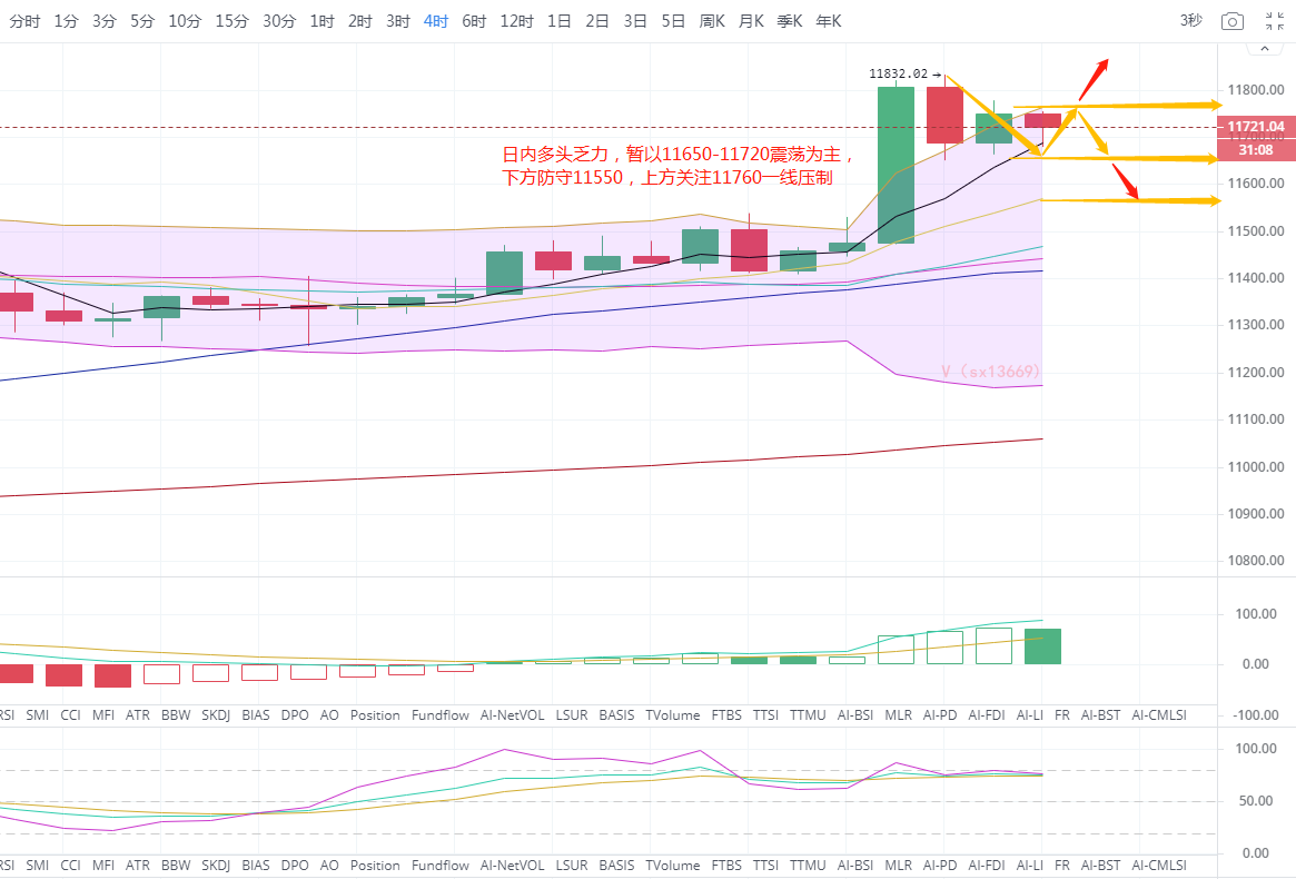看四小时图,布林带呈向上开口,各均线保持上攻姿态,日内涨幅不似昨日那般强势,行情开始回调,下探11650位置附近反弹回到11700一线,但是整体的走势还是偏向多单,短期有回调的风险,看12点收线是否可以企稳10700一线 ,所有日内诗萱建议回调多单为主,高位空单为辅。下方支撑关注11620-11650,上方压制关注11830-11800。