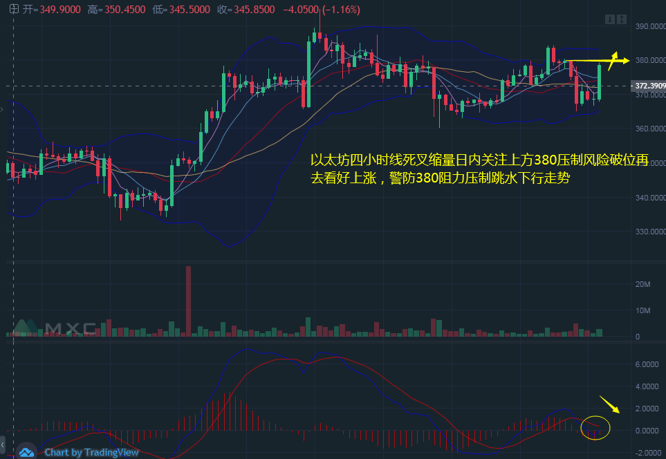 四小时线K线拉伸至布林带中轨了,日内关注十二点收线情况,企稳375支撑的话肯定白盘以太坊要大涨有望上破380压制,操作上日内关注上方阻力380压制,操作上行情破位的话肯定继续拉伸做多上方看好390目标。