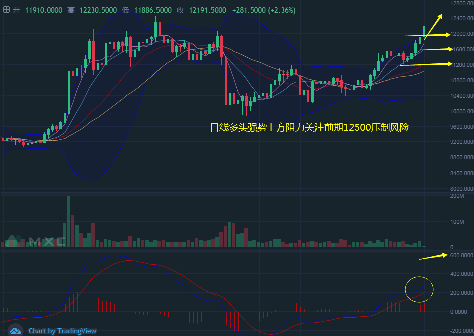 比特币日线上分析连续五个交易日震荡上涨,日线五阳连起,K线调整上行至布林带上攻,布林带缩口上扬,昨天比特币突破12000阻力压制调整上行,今早开盘再次今日刷新新高不断,基本上可观的看出比特币破位12000延续上涨趋势。日线上很多投资者想问韩币钰老师后市是否牛市来临?上午行情小幅冲高也是受到OK消息面回转提振行情上涨,操作日线级别肯定韩币钰老师短期做合约还是建议回撤做多为主。