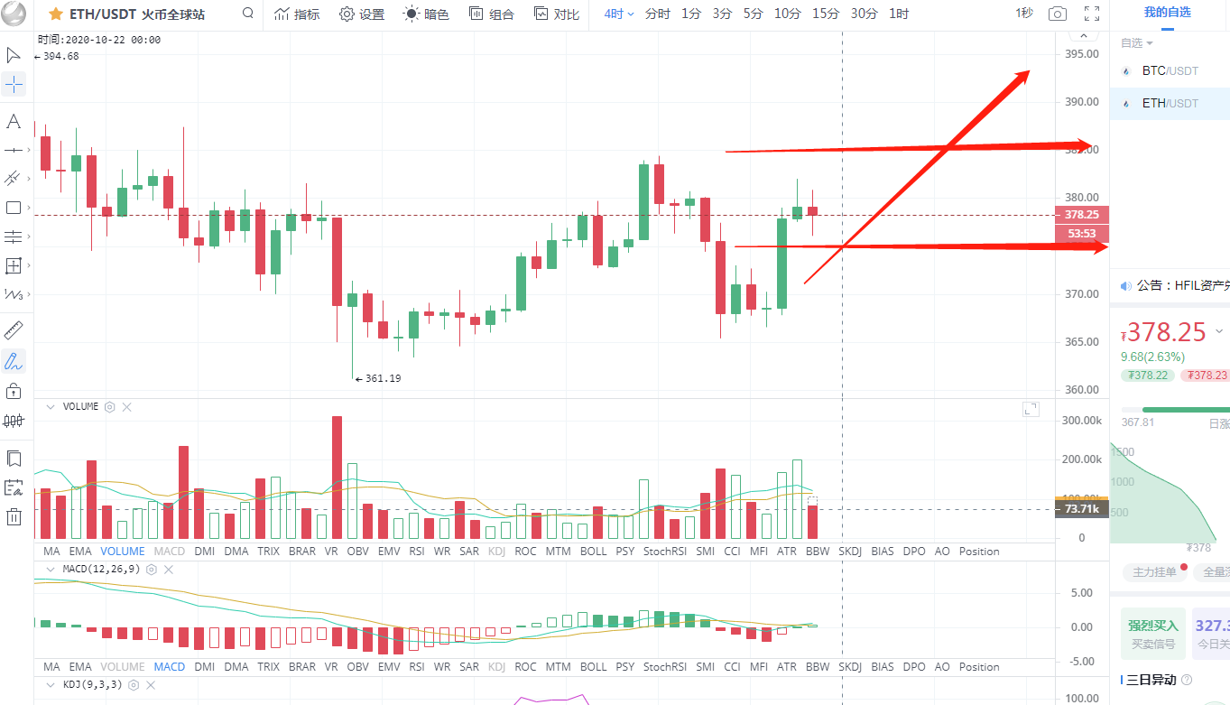 以太坊行情分析:从日线上看,以太坊昨日收取一根阴线,尽吐前两日涨幅,昨日走势与比特币截然相反,但所幸并未跌破布林带中轨支撑,而今天以太坊开始补涨,将昨日的跌幅弥补。布林带张口,k线运行在布林带中上轨,附图中MACD双线金叉在零轴上方运行,绿色动能柱逐渐缩量。就日级别线上看,以太坊多头回暖,但还是要关注上方385一线的压制。