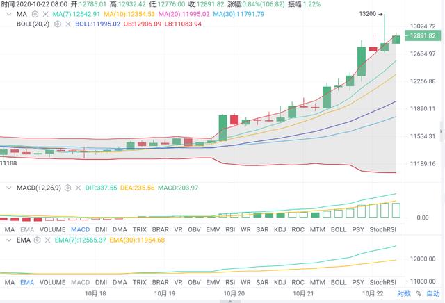 现币价运行于日线上轨之上,已经跳脱了布林带运行,日内操作下方支撑先看四小时布林带上轨12600附近,其次是12500位置;上方压制先关注13200;