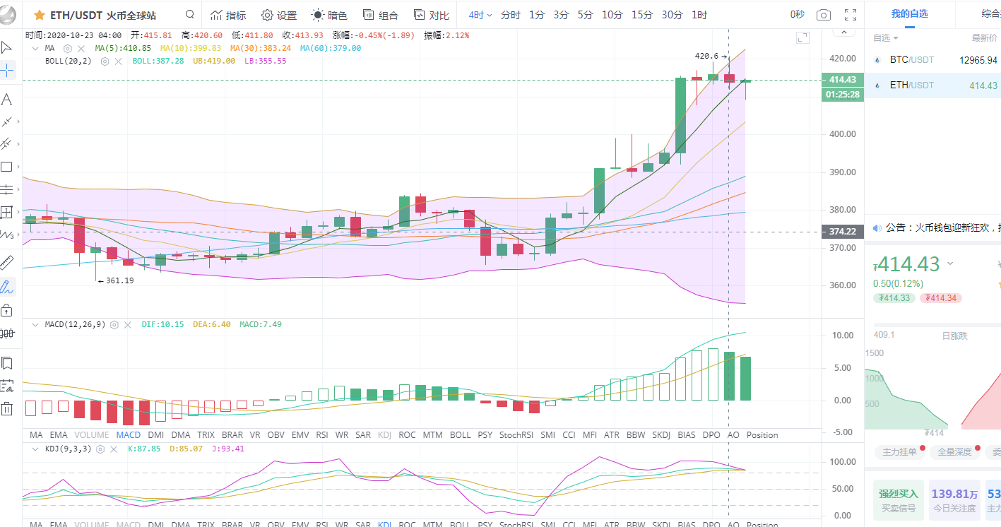 以太坊行情分析:以太坊昨日收取一根大阳线,直破布林带上轨,今日凌晨最高触及420.6一线后承压回落,从目前的情况来看,以太坊又开始跟随比特币走势同进同退了。日线上布林带开口向上,k线运行在布林带上轨上方,5日均线上穿10日均线呈上攻之态。附图中MACD双线金叉向上,绿色动能柱持续放量,KDJ三线金叉向上运行。就日级别线上看,以太坊回归正轨,整体的趋势偏向多头。