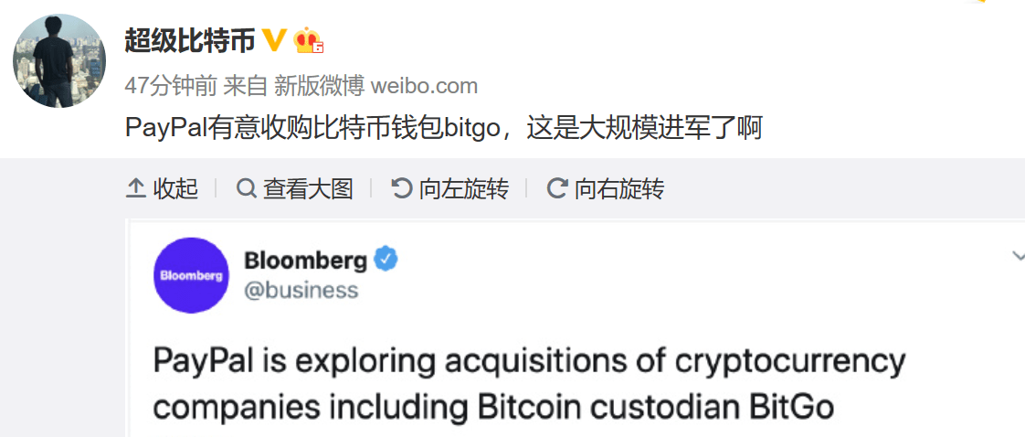最新消息:PayPal有意收购bitgo,也就是做WBTC的那家公司。