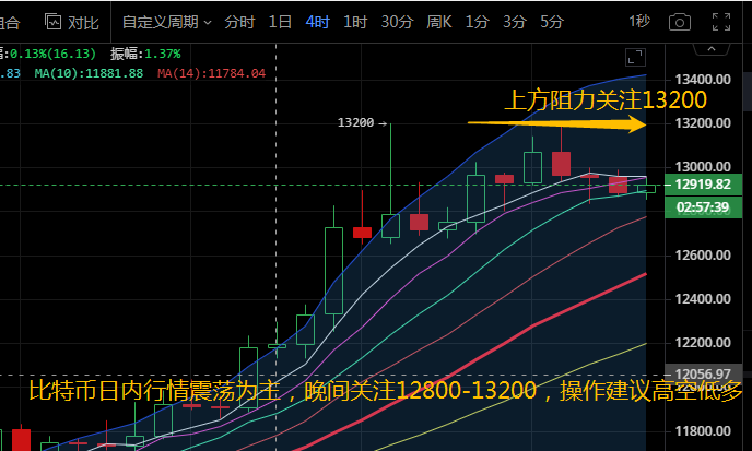 比特币小时线级别来看,布林带平缓向前运行,行情稳定在中下轨区域运行,各均线粘合运行在中轨下方。附图中MACD快慢线向下运行在零轴上方,红色动能柱放量。小时线级别来看,币价有一定的回踩需求。晚间操作汐柔建议关注上方阻力13200,下方12800支撑,操作建议高空低多即可。