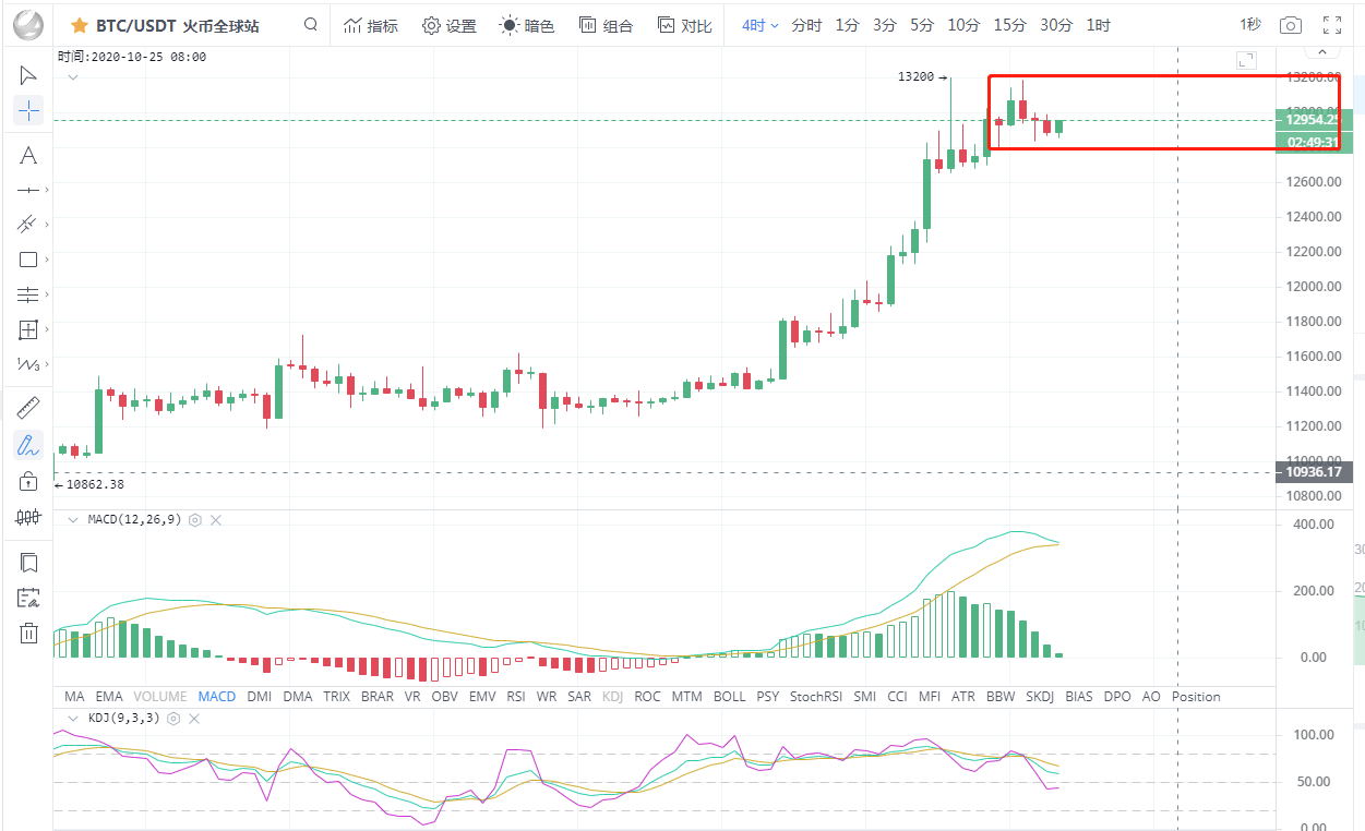 比特币行情分析:从日线上看,昨日收取一根小阳线,今日凌晨比特币向上冲击13200一线未果受阻回落,上方13200一线的压制还是很强的,目前价格承压回落,但仍保持在日线上轨之上运行,日线上布林带张口,各均线多头排列,多头气息还是较为浓重的,待币价重新站稳13000一线,大概率将继续上探13200一线,若顺势突破,后市将继续上探13500一线。附图中MACD双线金叉在零轴上方运行,绿色动能柱持续放量,KDJ三线平缓运行。就日级别线上看,多头趋势还是较为明显的,但上方13200一线强压,不可盲目追涨,谨防短期跳水。