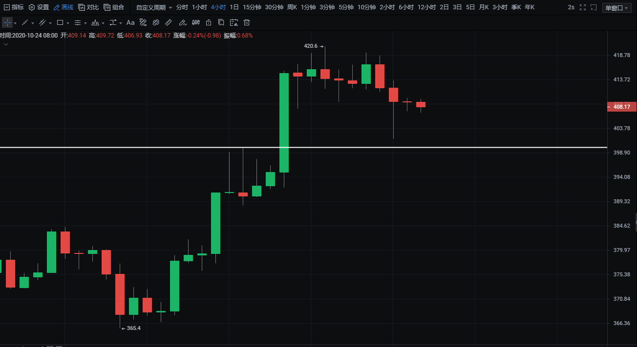 以太坊四小时级别来看价格昨日基本维持415一线来回震荡,整体走势联动比特币为主,晚间一波跳水下跌最低至401美金,布林带呈张口运行,日内来看任有下跌风险。幅图指标MACD于0轴上方有死叉迹象,KDJ指标三线向下发散,RSI指标三线向下拐头运行。上方压力位415,下方支撑位400。操作上高空低多为主。
