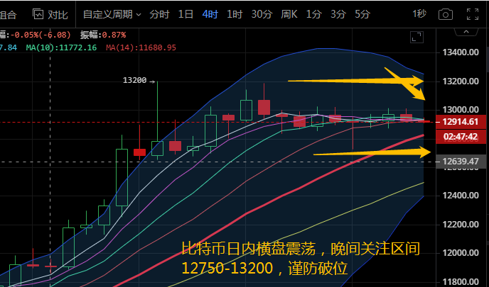 比特币四小时级别来看,布林带缩口向上运行,行情稳定在MA5附近运行,各均线上行姿态减缓,逐渐走平。附图中MACD快慢线死叉向下运行在零轴上方,空头动能柱放量,KDJ三线聚合。四小时级别来看,多头动能减弱,行情陷入多空胶着局面,晚间操作汐柔建议关注下方12700支撑,上方阻力13000-13200压制。