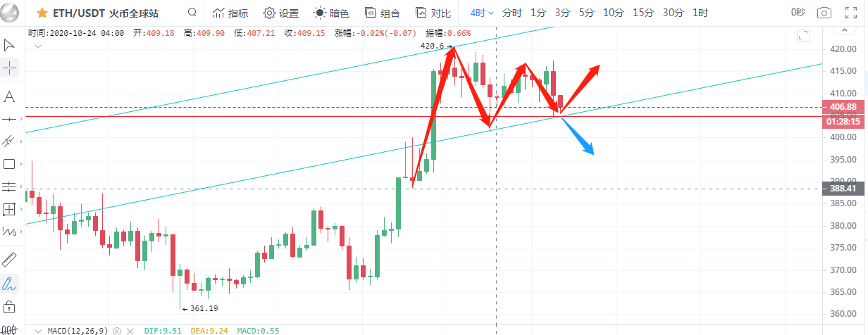 以太坊行情分析:以太坊随动比特币下午一点急速跳水从417.4下跌至404.57后触底反弹,目前运行在407一线附近。以太坊虽然经过一波跳水但并未跌破400一线。从四小时图看布林带缩口,5日均线与10日均线粘合在上方形成压制,附图中MACD双线死叉在零轴上方运行,红色动能柱持续放量,从指标上看以太坊偏向空头,晚间关注趋势线是否支撑有效.操作上建议企稳410一线后在多单买入,下破405后空单入场。