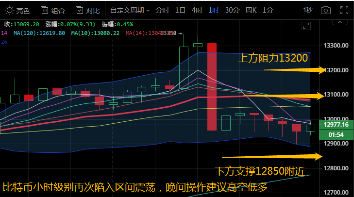 比特币四小时级别来看,布林带平缓向前运行,午间行情拉升打破上轨压制后跳水回到中轨附近运行。附图中MACD快慢线走平运行在零轴上方,红色动能柱放量,KDJ三线向下发散。四小时级别多头还是占据一定优势的,短期内空头释放量能,晚间重点关注13000一线能否企稳,下方12850附近支撑明显。