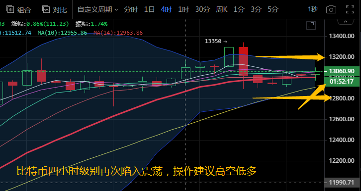 比特币四小时级别来看,布林带平缓向前运行,币价稳定在中轨附近运行。各均线粘合向前运行在中轨附近。附图中MACD快慢线向下运行在零轴上方,红色动能柱放量。KDJ三线聚合向下运行。四小时级别来看,多头趋势减弱,币价再次下探暂时未跌破12900下方支撑。