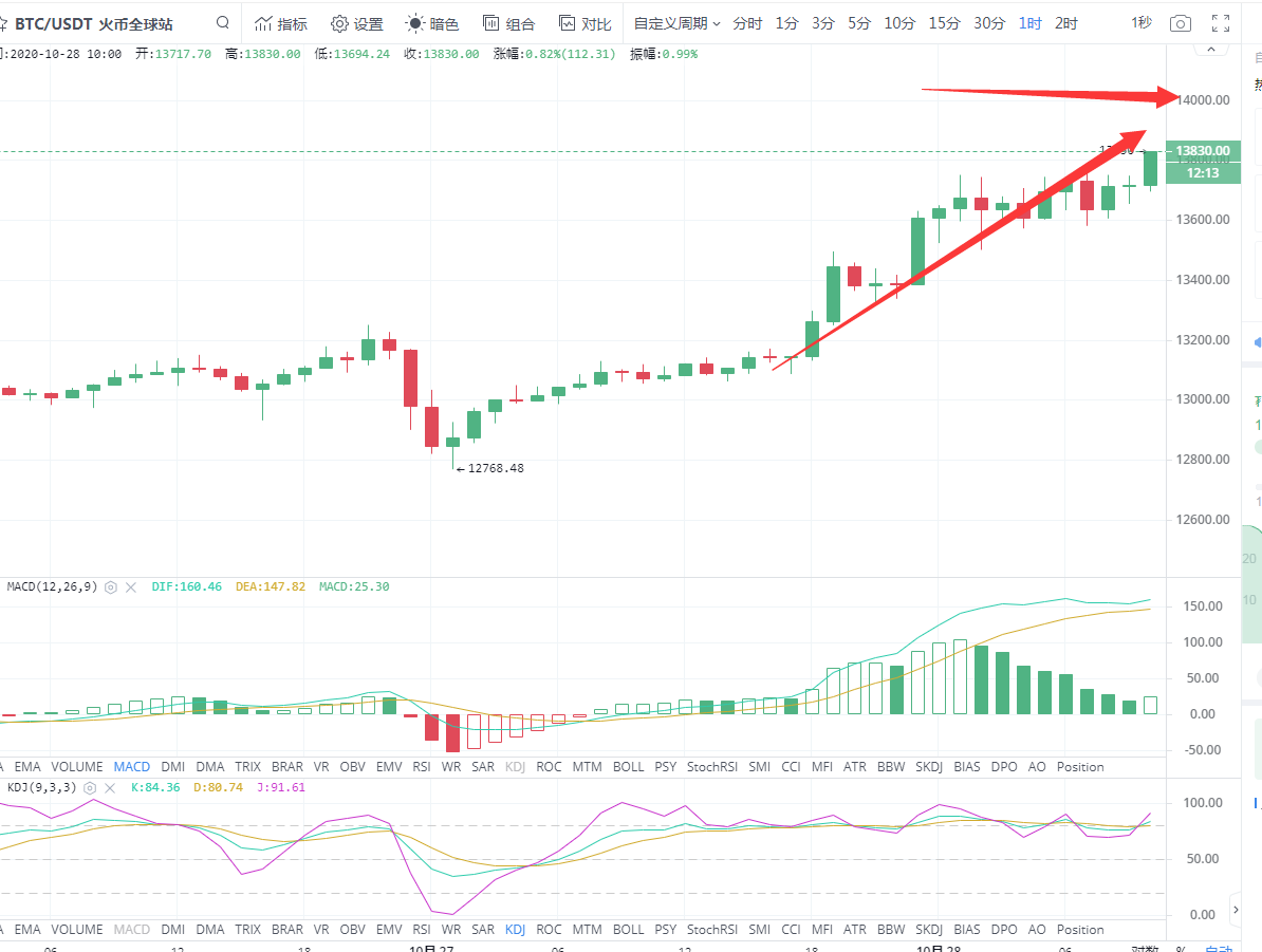 从日线上看行进过昨日白天的震荡盘整过后就开启了上行暴涨的状态多头几乎把前几日的震荡盘整的能量聚集起来一下子突破上方阻力位。一直冲到高点13786开始回落目前行情也在13700的位置还有上涨的趋势,上方高位阻力我们可以暂看14000。从四小时线上看,比特币在收复13000点失地直接来了一个报复性的上涨,本身雅晴认为,多头能够持续的性的上涨并且目前币价脱离布林带在上轨运行一直保持着稳定上涨的趋势,则离不开米联储的货币政策一直在超发货币,导致美元的贬值。更多的投资者会把眼光放在虚拟资产上寻求避险。从RSI指标上看一直上呈上行呈强的趋势,小时线上看目前的行情一直是震荡上行的趋势MACD成金叉上行KDJ三线聚拢向上散发并且,按照目前的趋势来看行情,多头的放量并没有止步于此。综合各项指标上分析今日操作继续以回踩做多为主。
