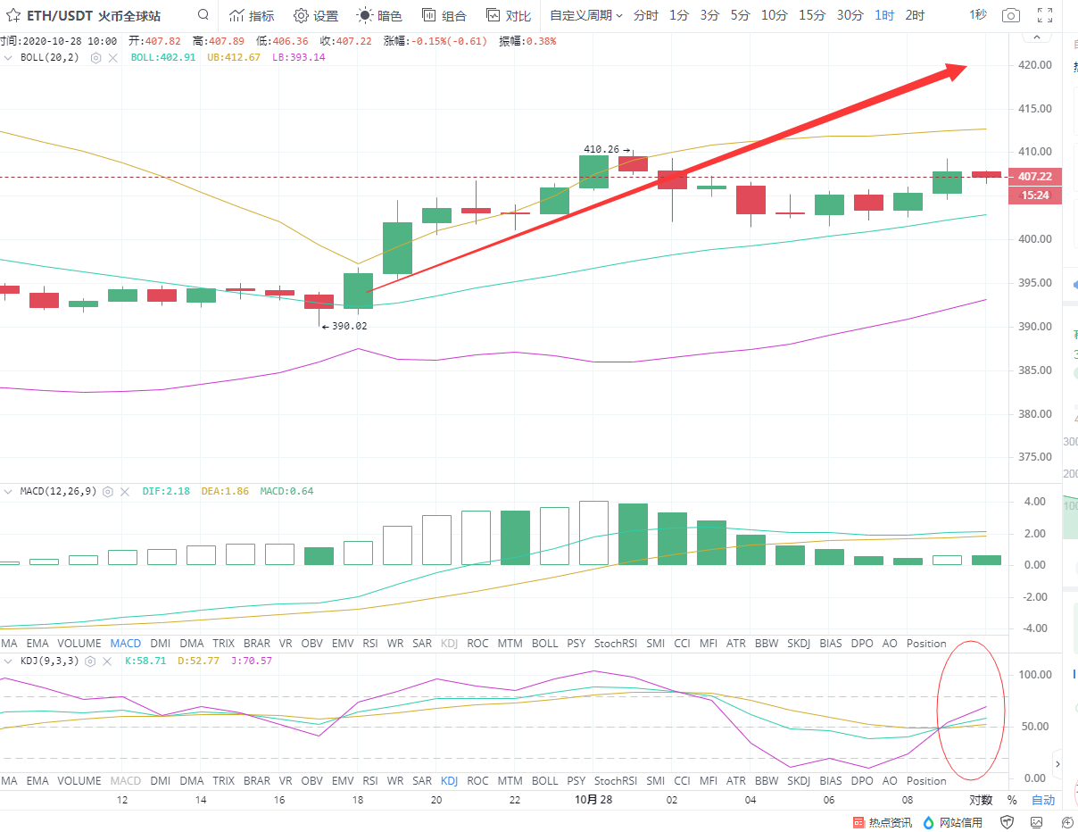 以太坊在昨日比特币上涨的大趋势带动下,在从新回到400大关上并没迎来报复性的上涨,反而很稳健的上行,最高到达410的位置,涨幅2.75%四小时线上看币价目前在布林带中轨的位置上虽然目前价格在407的位置上,但雅晴认为以太坊的多头情绪并没有彻底激发,后期仍会有向比特币一样的爆发性的一个上涨趋势。小时线上看,MACD平行上行且绿色动能柱也不断的放量,KDJ三线交叉向上散发。综合这些指标上的分析判断,操作建议上雅晴建议以回踩做多为主。比较稳健