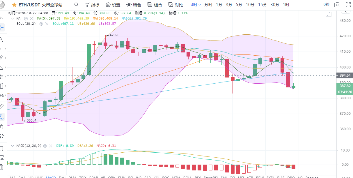 以太坊行情分析:从四小时图看,布林带张口下行,k线运行在布林带下轨附近,5日均线下穿10日均线呈死叉状态。晚间一波跳水下跌至386一线后开始反弹,但反弹相对较弱,空头气息较为浓重,晚间关注上方390一线压制,若行情反弹企稳390一线我们可以多单入场,行情下破385一线空单入场。附图中MACD双线死叉在零轴下方,红色动能柱持续放量。