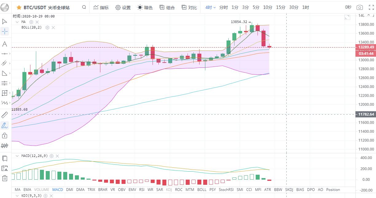 比特币行情分析:从四小时图看,布林带张口,币价上午一波暴力拉升后开始回落,5日均线由原来的上攻之态开始扭头向下,多头情绪开始低糜,空军顺势而入,晚间一波跳水至13226后开始反弹,附图中MACD双线金叉在零轴上方运行,绿色动能柱开始缩量。综合来看,行情的趋势由多头转为空头,我们晚间操作反弹做空为主,低多为辅,晚间关注下方13200一线支撑,上方压力位13500。