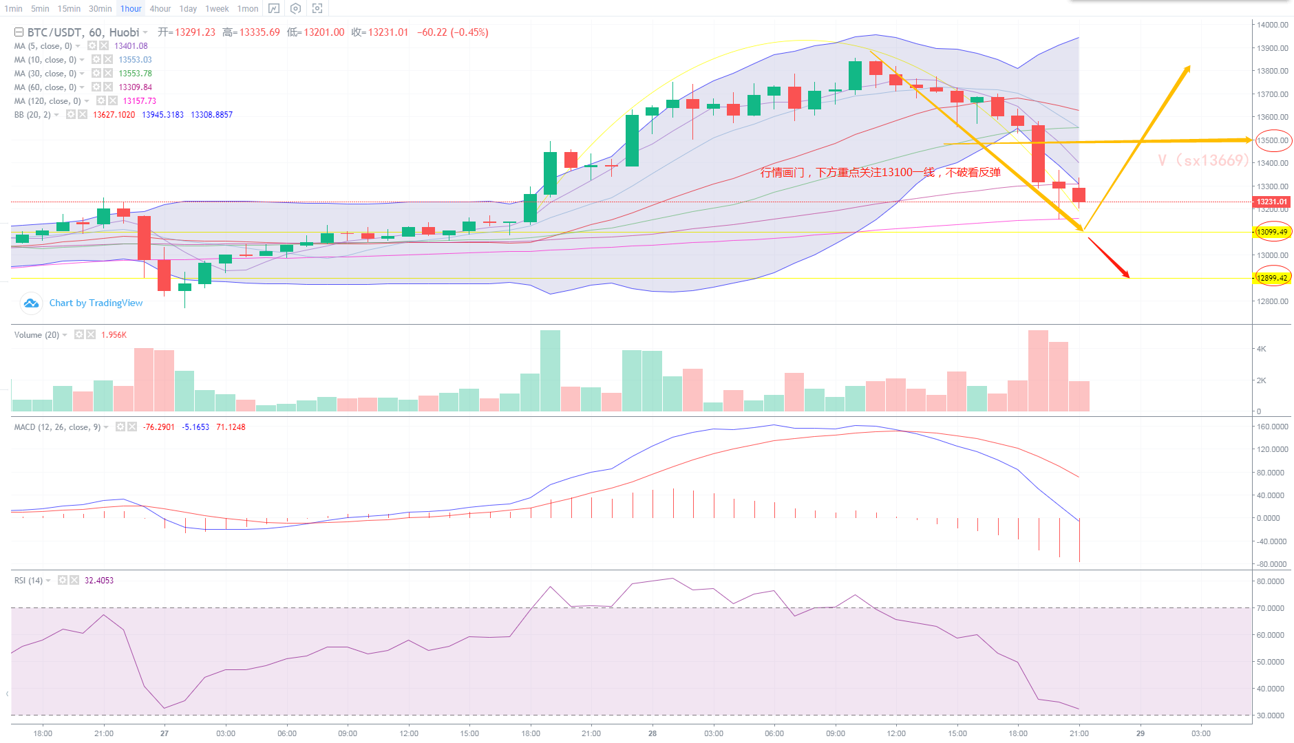 四小时图上看,布林带开口打开,K线从中午12点起结束7连阳,价格从上轨回落中轨,还会继续下探13100前期重要支撑位,13200短支撑已破,就前期的大涨走势看13100一线可能是晚间多头反转的起点,晚间策略诗萱建议破位跟空,再回调做多。小时图上看,行情画门,下午价格一路下跌收阴跌破下轨,触及120日均线反弹。附图指标MACD指标空头持续放量,RSI直接从80高位插入30低位,就盘面指标看,跌势还会继续。晚间操作下方关注13100位置,上方短期看13350位置。