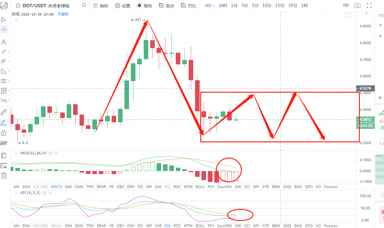 DOT行情分析:从四小时图看,布林带走势平缓,k线运行在布林带中轨下方,5日均线的下攻之势开始走缓,行情跌势有所减缓,附图MACD双线死叉在零轴附近运行,红色动能柱有所缩量,KDJ三线平行运行。上方压力位4.5,下方支撑位4.2.综合来看,行情处于下跌后的盘整修复阶段,高空低多即可。