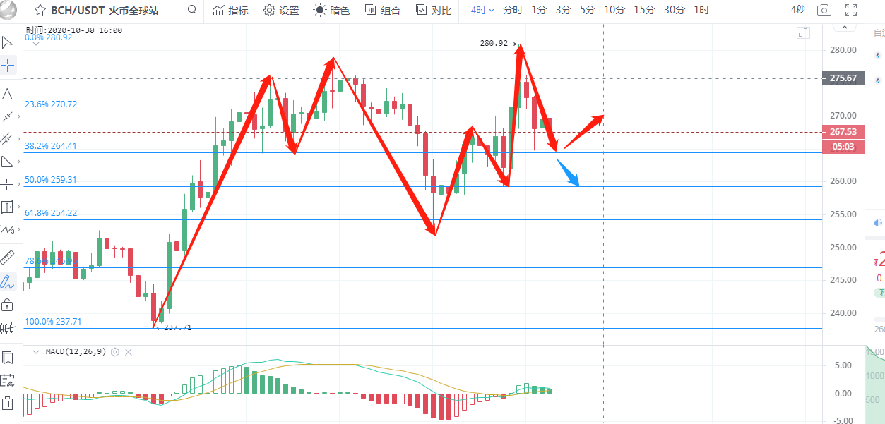 BCH行情分析:从四小时图看,币价自昨日冲高280.92一线后承压回落至264.7一线后开始反弹,跌势有所减缓,布林带缩口向下,5日均线压制币价承压下行风险,附图中MACD粘合有形成死叉的迹象,绿色动能柱逐渐缩量。综合来看,行情偏向空头,目前关注下方斐波那契0.382一线264.41支撑,若下破将继续下探测试斐波那契0.5一线259.31.