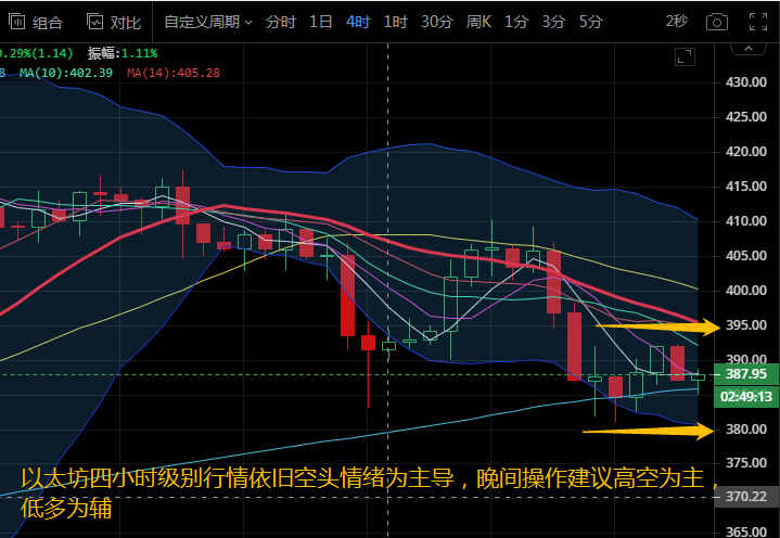 以太坊日内行情跟随比特币走势,目前还处在不断回踩的趋势当中。四小时级别来看,布林带开口向下运行,币价稳定在中下轨区域运行,MA5下穿MA10死叉向下运行,其它各均线拐头向下运行。附图中MACD快慢线向下拐头运行在零轴下方,红色动能柱放量。四小时级别来看,空头情绪浓烈,晚间操作建议关注下方380支撑,上方阻力看到395-400附近,操作建议高空为主,低多为辅。