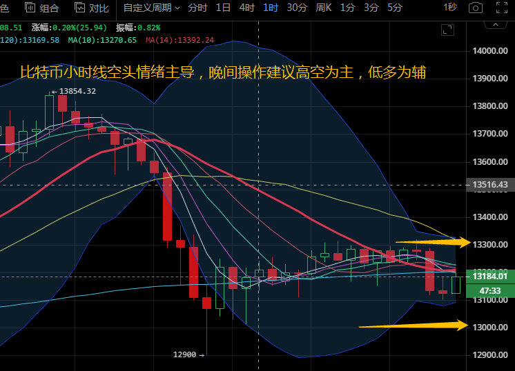 比特币小时线级别来看,布林带缩口向前运行,一根大阴线将币价拉下中轨,目前运行在中下轨区域。MA5下穿MA10形成死叉向下运行。附图中MACD快慢线粘合向前运行在零轴下方,绿色动能柱小幅度放量,KDJ三线向下发散。小时线级别来看,行情走势震荡偏下行风险。晚间操作关注下方12900-13000支撑,上方阻力关注13350,操作建议高空为主,低多为辅。