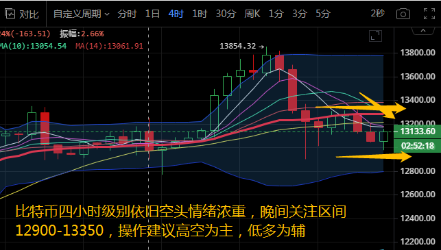 比特币小时线级别来看,布林带缩口向前运行,币价向下刺破下轨后再次反弹。MA5下穿MA10形成死叉向下运行。附图中MACD快慢线粘合向前运行在零轴下方,红色动能柱小幅度放量,KDJ三线向下发散。小时线级别来看,行情走势震荡偏下行风险。晚间操作关注下方12900支撑,上方阻力关注13350,操作建议高空为主,低多为辅添加微信pyt3069。