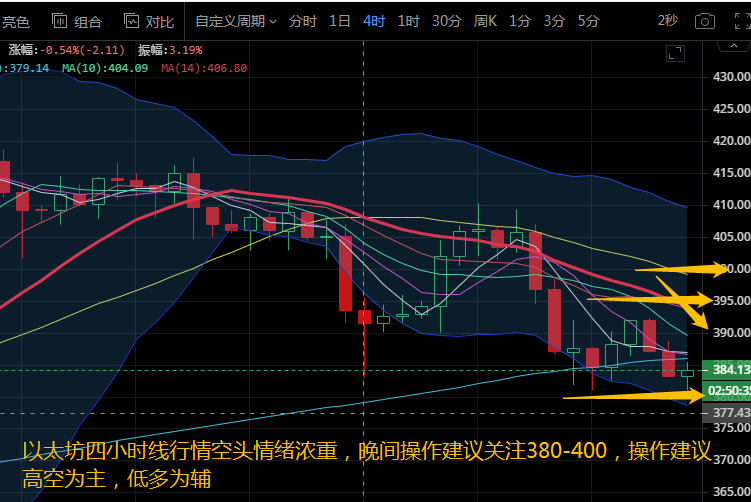 以太坊日内行情跟随比特币走势,目前还处在不断回踩的趋势当中,晚间的回踩跌破下轨后再次反弹。四小时级别来看,布林带开口向下运行,币价稳定在中下轨区域运行,MA5下穿MA10死叉向下运行,其它各均线拐头向下运行。附图中MACD快慢线向下拐头运行在零轴下方,红色动能柱放量。四小时级别来看,空头情绪浓烈,晚间操作建议关注下方380支撑,上方阻力看到395-400附近,操作建议高空为主,低多为辅关注公众号:币汐柔。