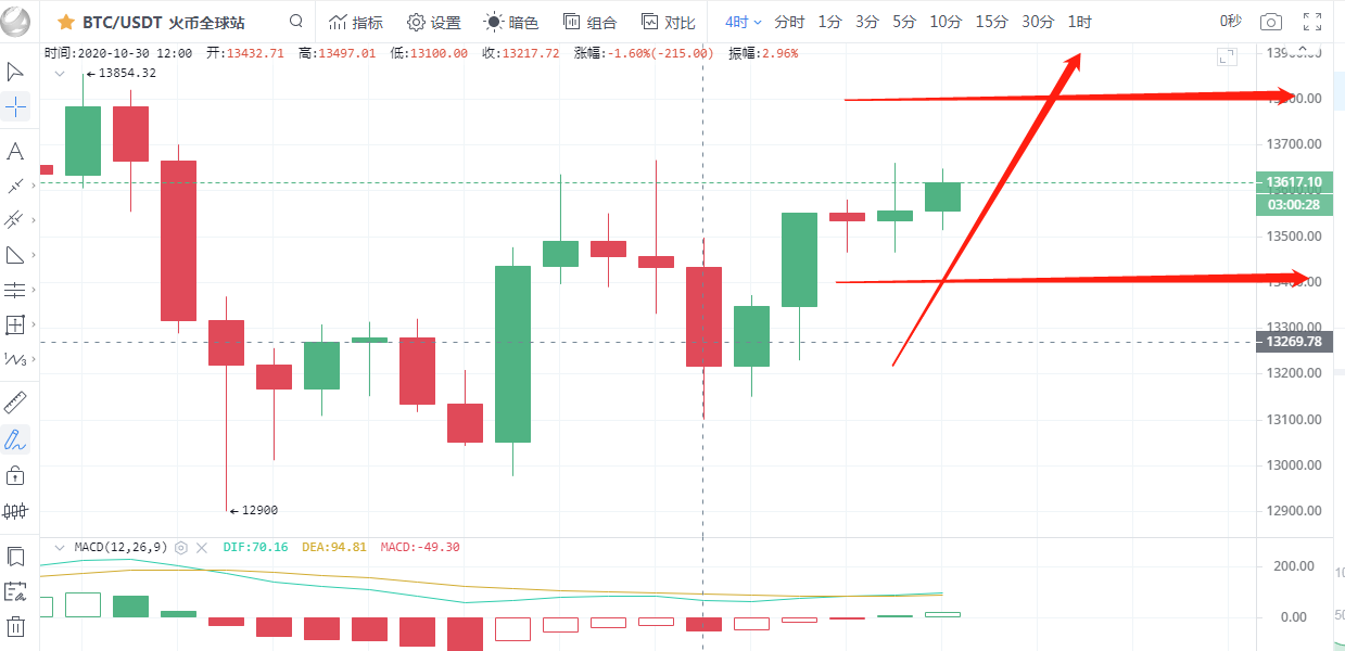 比特币行情分析:昨日收取一根下影线稍长的小阳线,昨日虚破10日均线获得13100一线支撑后一路上行,最终回到5日均线附近运行。日线上从盘面上看处于震荡上行的趋势,虽然连续三个周期行情回调的深度较深,但最終在10日均线的支撑下回到上行趋势中去,多头趋势并未被破坏,日线上布林带张口上行,各均线呈现多头排列,MACD双线金叉在零轴上方运行,绿色动能柱弱势加强。日线上比特币多头还是佷强势,短期建议以低多思路为主,上方阻力关口13800,其次上方14000强压制。