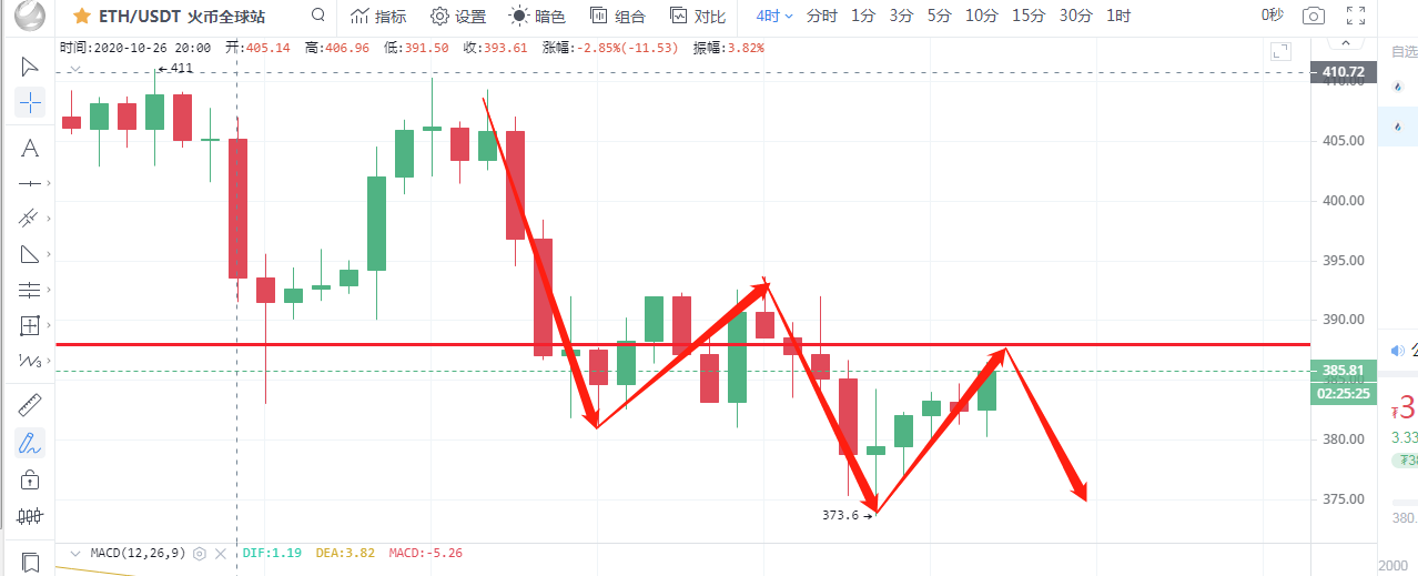 以太坊行情分析:以太坊昨日收取一根下影线稍长的阴线,昨日上方触及高点393.64一线后承压回落,下穿布林带中轨来到373.6一线获得60日均线支撑开始有所反弹重新回到380上方区域运行,日线上看以太坊于比特币截然不同处于震荡下行的局面。日线上布林带张口,k线受布林带中轨压制承压下行风险。若以太坊不能重新回到布林带中上轨运行,那么大概率会延续下跌的局面。附图中MACD双线死叉在零轴上方运行,红色动能柱持续放量。日线上以太坊空头还是较为浓重,短期建议以高空为主