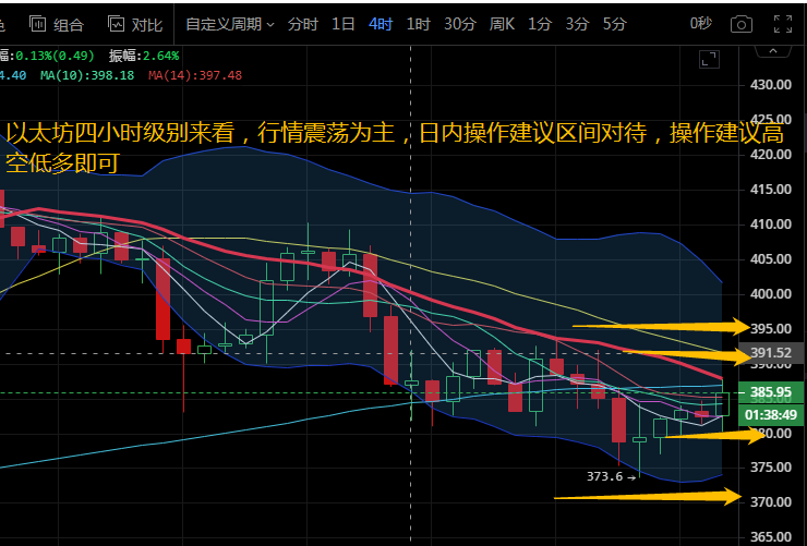 以太坊昨日凌晨行情上行刷新新高至393.64后开始一路回踩,昨日晚间向下触及最低点373.6后一路震荡上行,目前稳定在396附近。