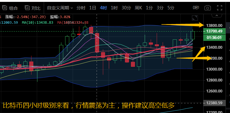 比特币四小时级别来看,布林带缩口向前运行,币价昨日跌破中轨支撑后迅速反弹,目前稳定在中上轨区域,MA5和MA10微微向上拐头运行。附图中MACD快慢线粘合运行在零轴附近。KDJ三线向上发散。四小时级别行情多头占优,日内操作重点关注上方阻力13700-13850,下方关注支撑13100。汐柔建议操作建议高空低多即可关注公众号:币汐柔。