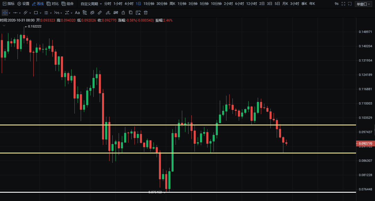 ADA日线级别来看价格收取八连阴,各均线拐头向下运行,鉴于主流币最近回调,山寨币跟跌不跟涨,下跌趋势也是加大,短期受0.0891一线支撑,上方压力位0.1004。从盘面来看还有下跌风险,短期不建议介入。