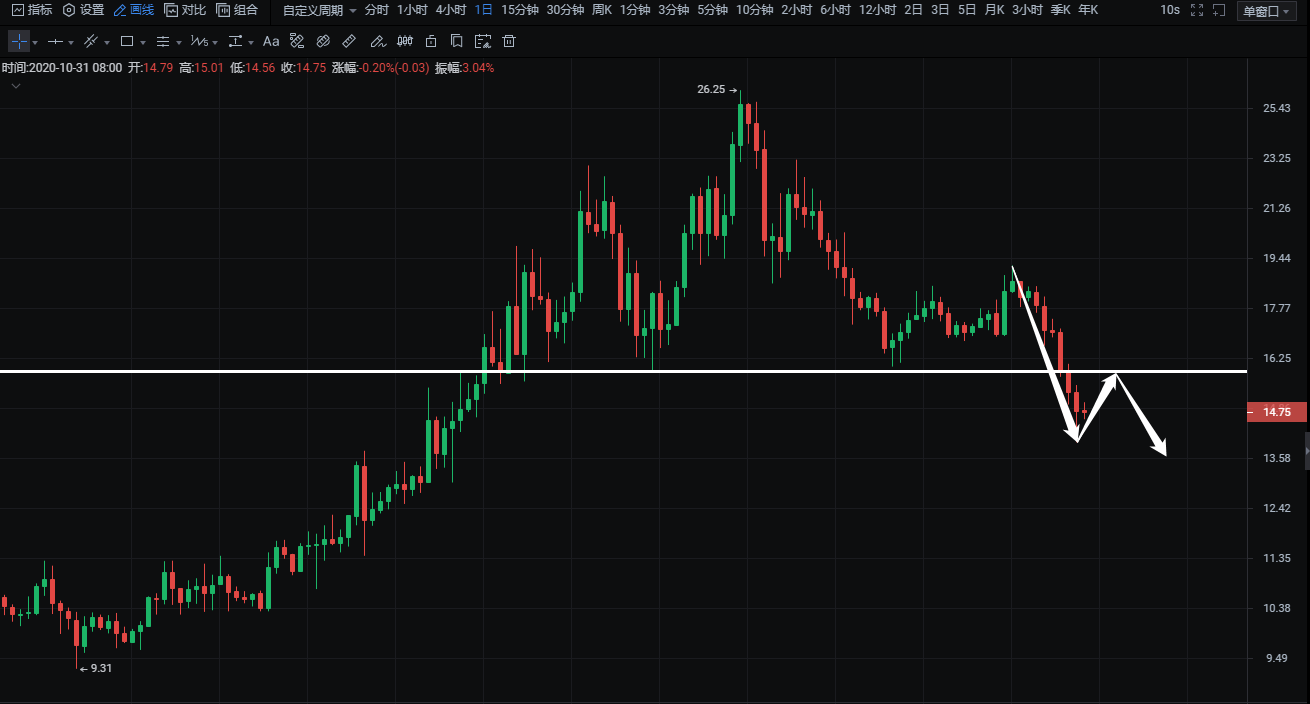 NEO日线级别来看日线收取六连阴,价格跌破颈线支撑,预计后期反抽后还有低点,短期不建议介入,短线采取高空为主。上方压力位16,下方支撑位13.5。